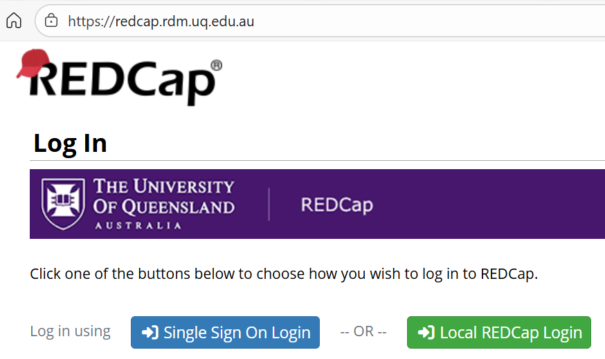 Existing users should log in using the green “Local REDCap Login” option and their current username and password. The “Single Sign On Login" method will not be available immediately and requires a support request via redcap@uq.edu.au
